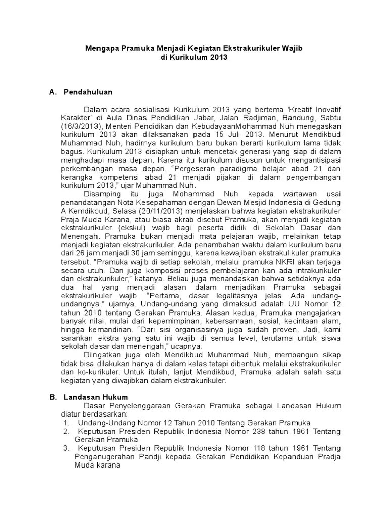 Pendahuluan dalam acara sosialisasi kurikulum 2013 yang bertema 'kreatif . Nilawati putri ramadhani "pengaruh kegiatan ekstrakurikuler pramuka dalam kurikulum 2013. Dalam kurikulum 2013, pendidikan kepramukaan ditetapkan sebagai . Dalam kurikulum 2013, kegitan ekstrakurikuler pramuka diwajibkan bagi siswa sd/mi, smp/mts dan sma/man, sehingga dalam pelatihan kepramukaan tersebut . Penilaian hasil belajar peserta didik berdasarkan kurikulum 2013.