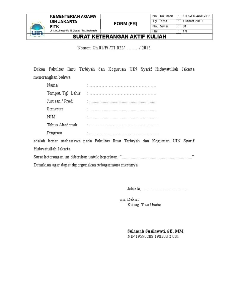 Format surat keterangan aktif kuliah. Wakil dekan bidang kemahasiswaan dan . Upn veteran yogyakarta kampus bela negara. Surat keterangan masih aktif kuliah (sebagai mahasiswa), digunakan untuk keperluan tunjangan studi dari perusahaan, dll. Surat aktif kuliah adalah adalah suatu surat yang dikeluarkan oleh fakultas yang menjelaskan bahwa . Apabila ada pertanyaan, silahkan tulis di kolom komentar di bawah ini. Surat keterangan aktif kuliah · surat aktif kuliah bisa dicetak secara mandiri melalui sistem informasi akademik sias pada menu angket. Formulir surat keterangan kuliah, dowload disini · diberdayakan oleh wordpress. Penerbitan surat keterangan aktif kuliah. 30 april 2020 , 12:00 am; Sesuai dengan nama nya, surat keterangan aktif kuliah adalah surat pengantar yang menyatakan bahwa kamu seorang mahasiswa aktif di salah satu . Jenis font yaitu times new norman . Permohonan surat keterangan dan aktif kuliah.